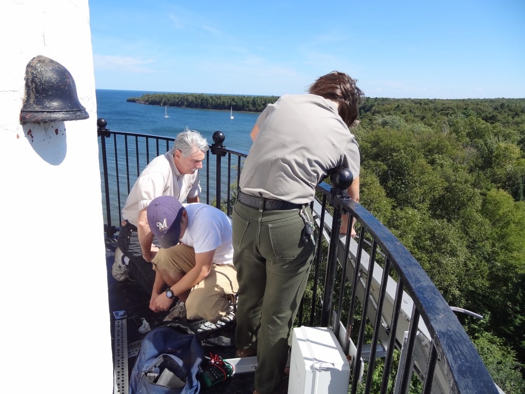 The National Park Service was cooperating with the project, so they drove our small research team out to the island for the installation. Once at the island, the park service staffer let us into the lighthouse and led us to the top of the tower.