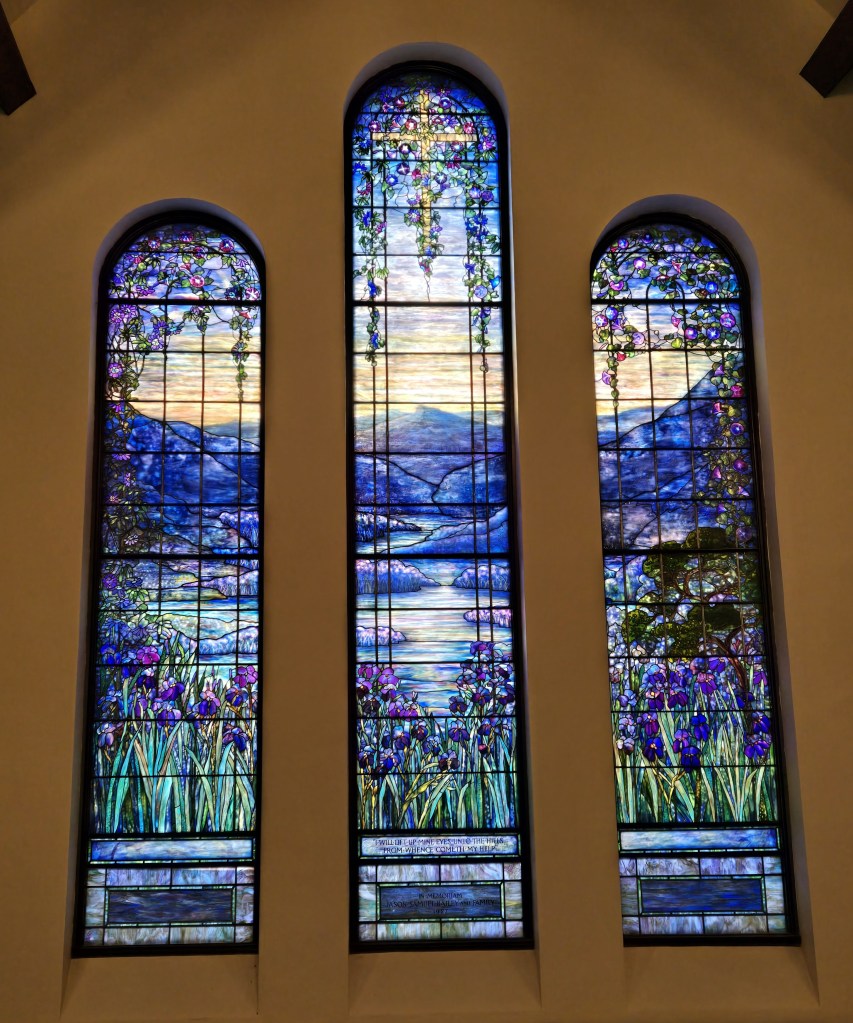 One of them also pointed out a trio of gorgeous 1927 Tiffany Studios stained glass windows that grace one wall. They feature irises and morning glories ringing a lake and mountain scene, with the words, “I will lift up mine eyes unto the hills from whence cometh my help.” According to a sign about the windows, a stained-glass consultant called the design one of the studio’s “greatest.” It incorporates several signature techniques: plating, where three layers of glass are used to achieve depth of color; mottling, which recreates intense sunlight as filtered through leaves; and acid etching, which involves removing a layer of colored glass to reveal a clear or palely tinted base glass. Intense leading is used on the windows to depict the organic lines of flowers and foliage.