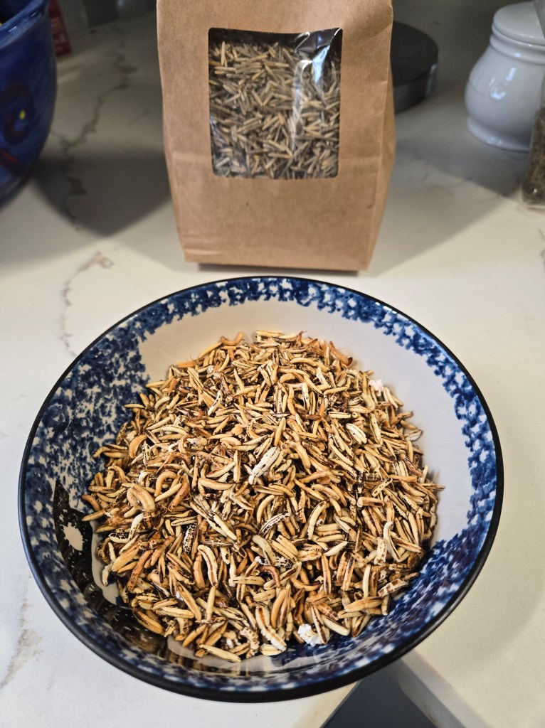 Seeing the puffed wild rice reminded me that the Good Berry cookbook had a recipe for it, so when I returned home, I made some. It requires wild rice that has been picked and parched in a traditional manner. This makes it a lighter color (dull brown) versus the paddy-grown wild rice, which is dark and shiny.