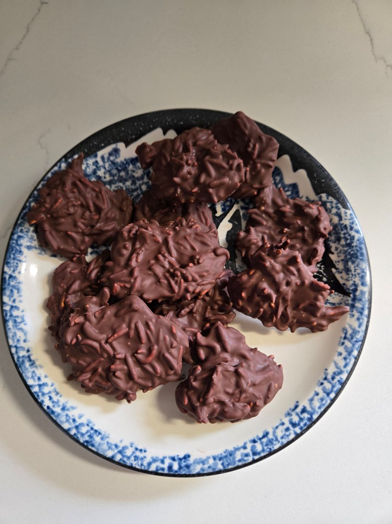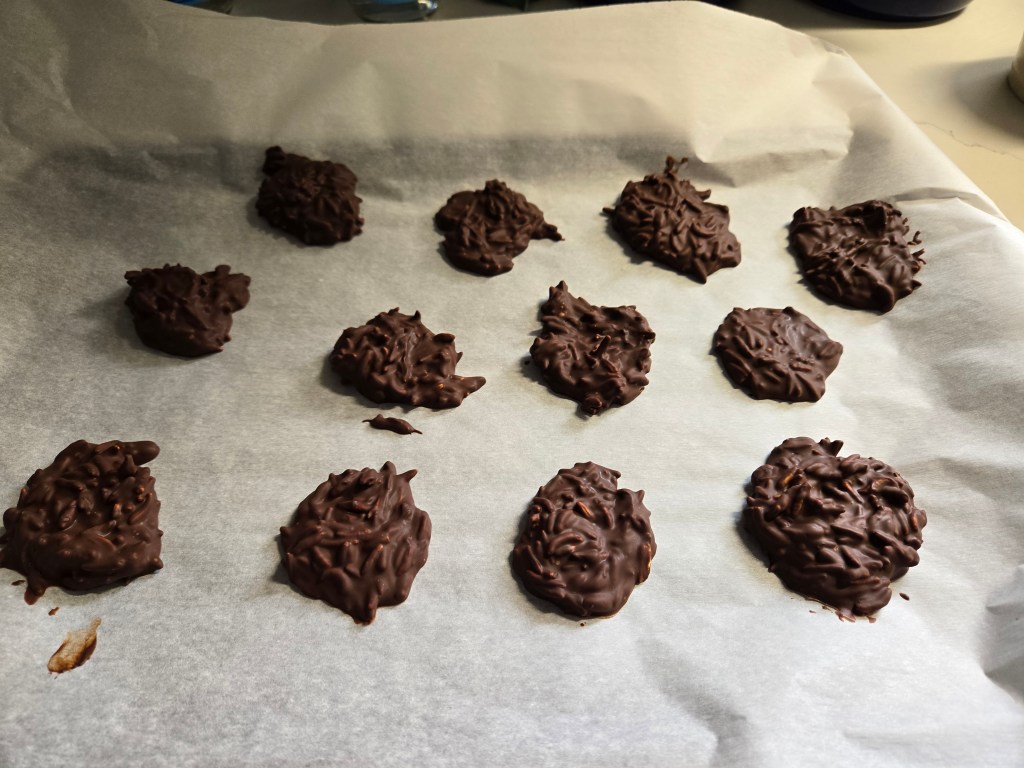 I made the puffed wild rice chocolates. Very good! The recipe calls for making them in a flat sheet, but I chose to clump them instead. They taste rather like a Nestle crunch bar.