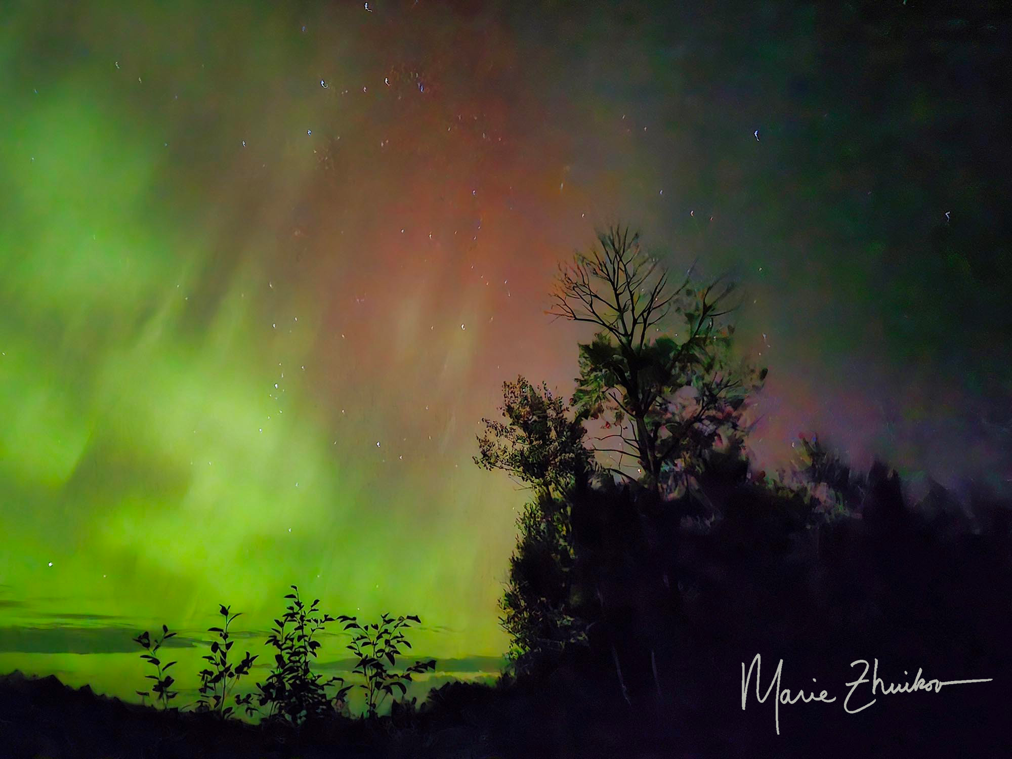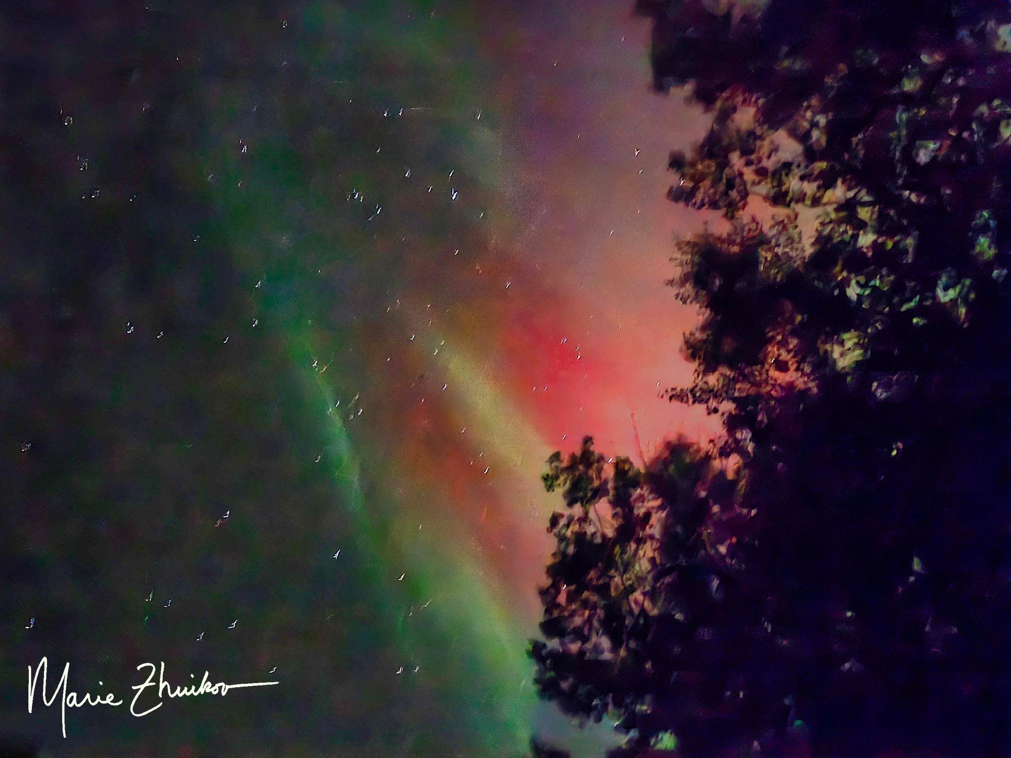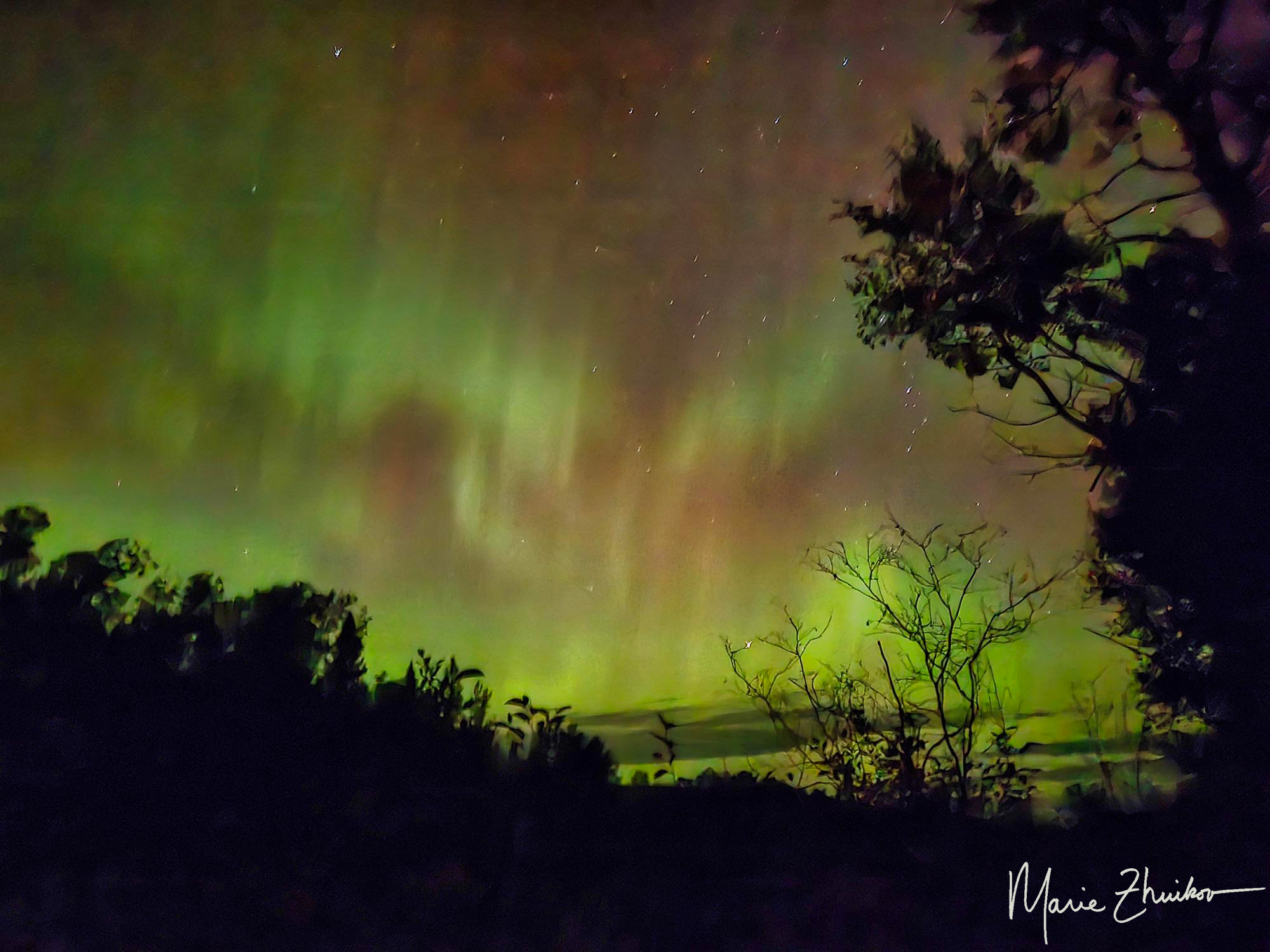 A green curtain filled the sky, with some red overtones. As the lights continued to dance, the red intensified. This color is rare in auroras.