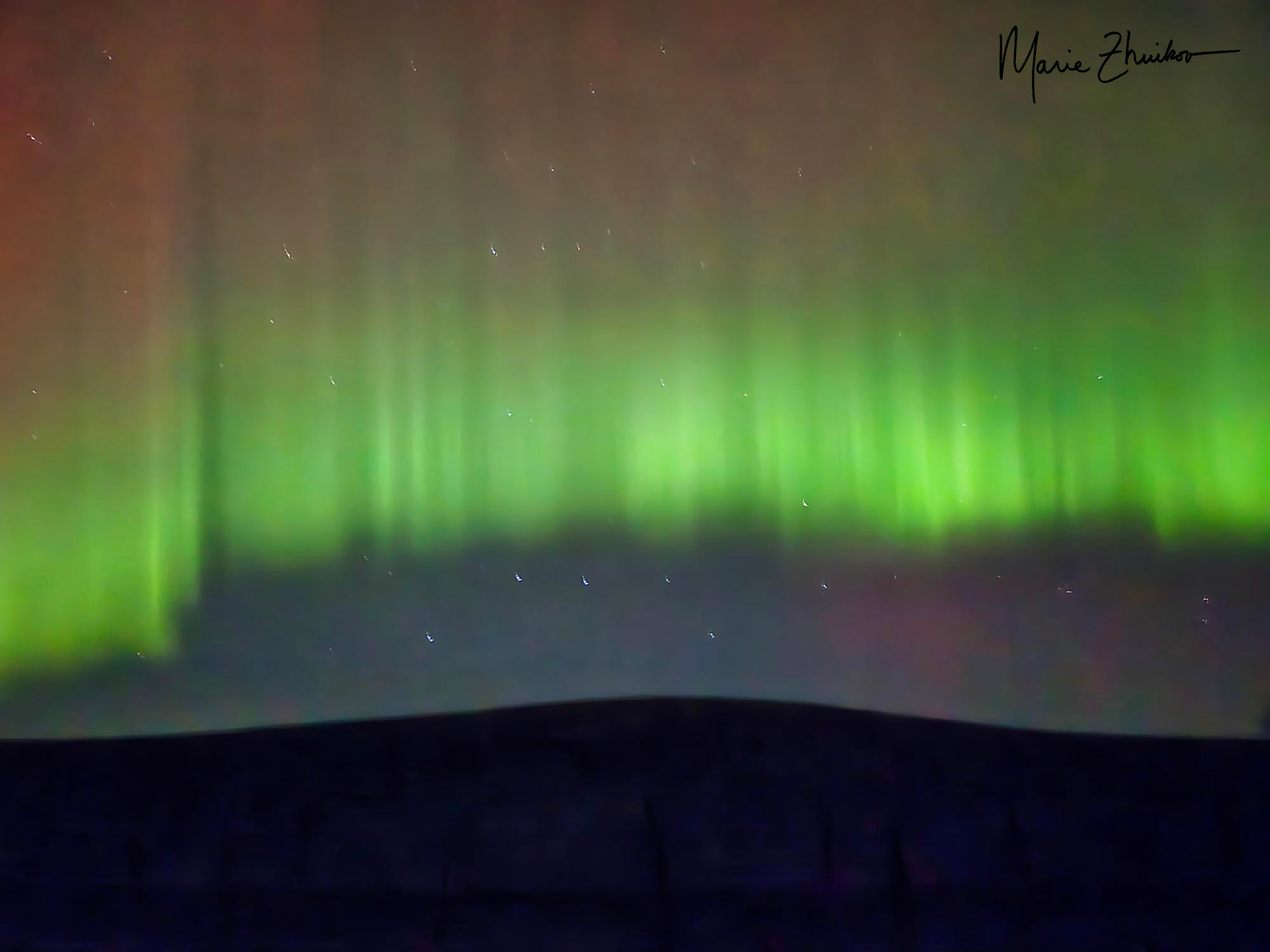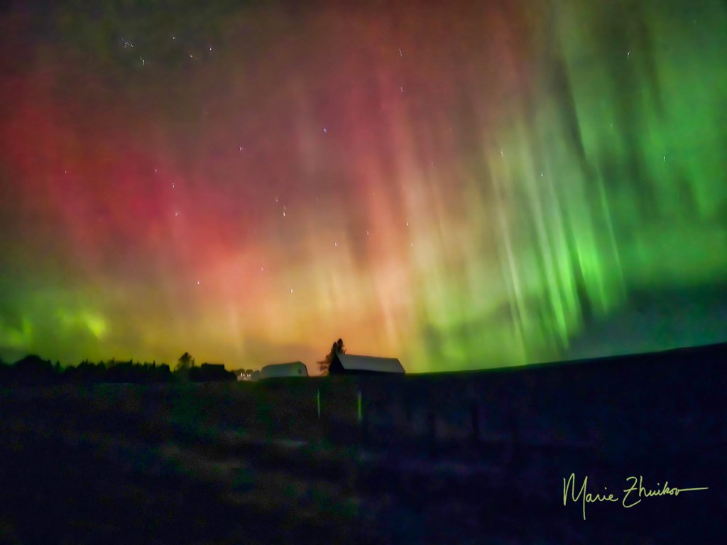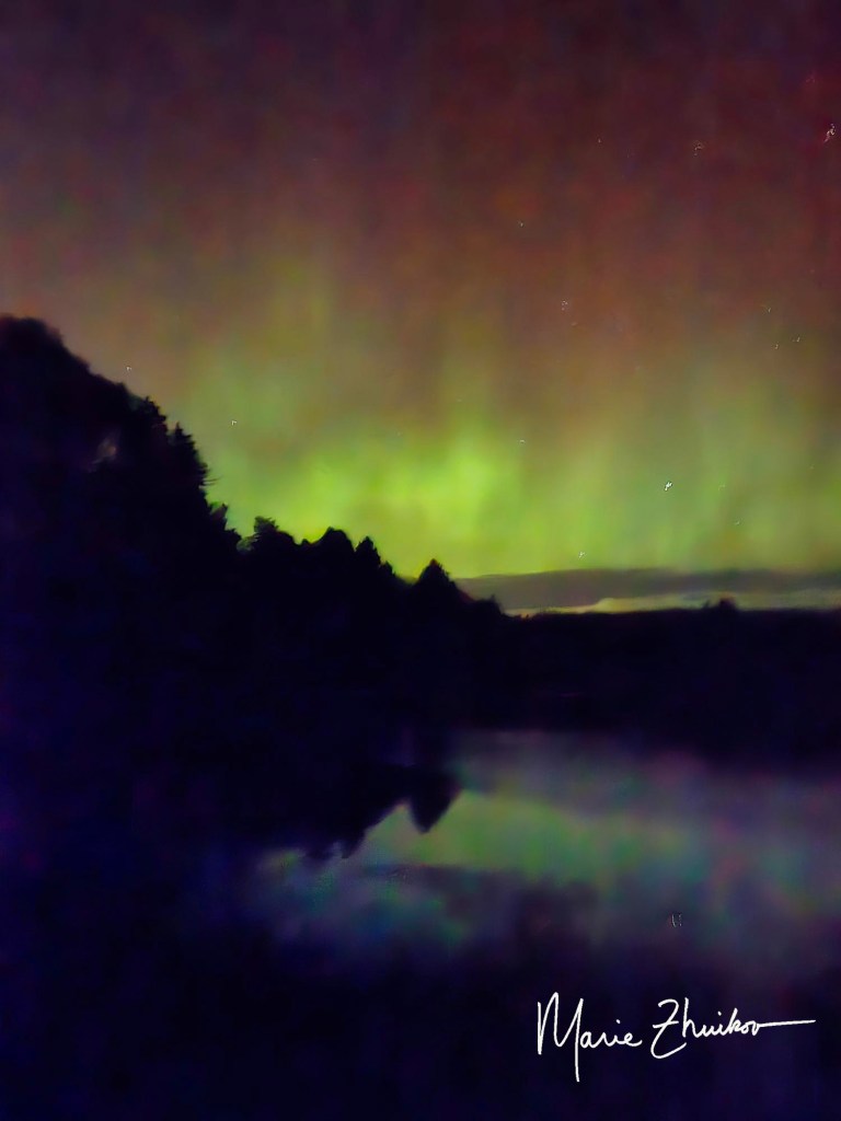 A green curtain filled the sky, with some red overtones. As the lights continued to dance, the red intensified. This color is rare in auroras.