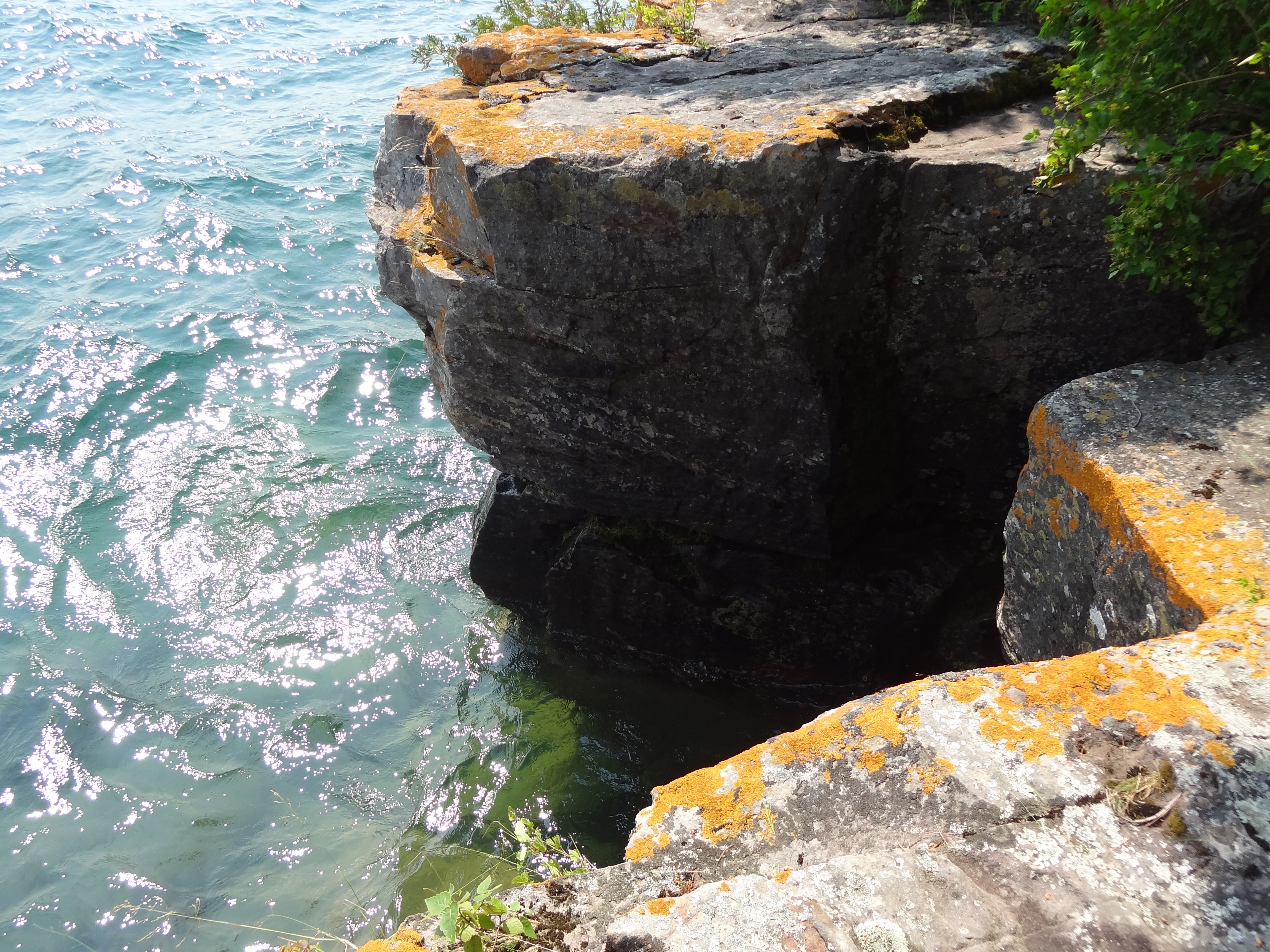 Fortified in the morning by a breakfast of haggis and eggs, we rowed back ashore and hiked the Quarry Trail, which eventually leads to an old brownstone quarry (no longer in service). We stopped before the quarry and spent and pleasant time on a sandstone ledge, enjoying sun on the lakeshore. Hundreds of colorful mushrooms piqued our interest during the 6-1/2-mile stroll – purples, oranges, reds, yellows, browns. It’s a good fall for mushrooms around here.
